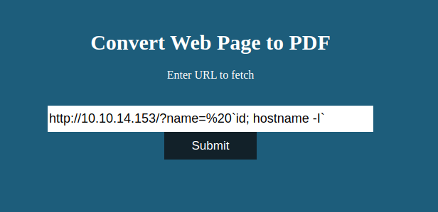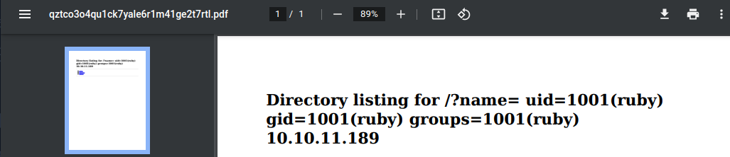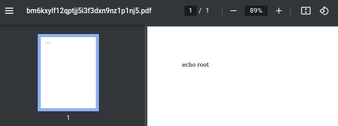 Uma prova de conceito foi executada para confirmar a vulnerabilidade tentando ecoar o usuário atual dentro do conteúdo do PDF. Ao passar o comando como um parâmetro de URL, o backend executou a instrução e incorporou a saída no documento resultante.