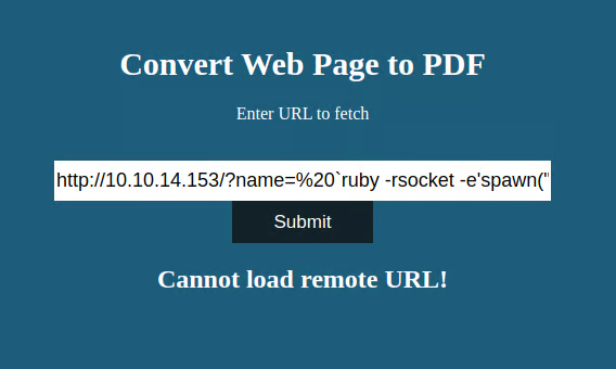 A aplicação é um utilitário "Convert Web Page to PDF" rodando em Ruby-on-Rails e servido pelo Phusion Passenger 6.0.15. Uma busca por vulnerabilidades conhecidas no Phusion Passenger foi conduzida; no entanto, os resultados foram principalmente exploits legados para Windows e não se alinharam com o ambiente alvo.